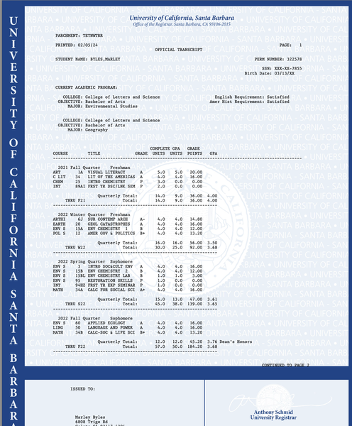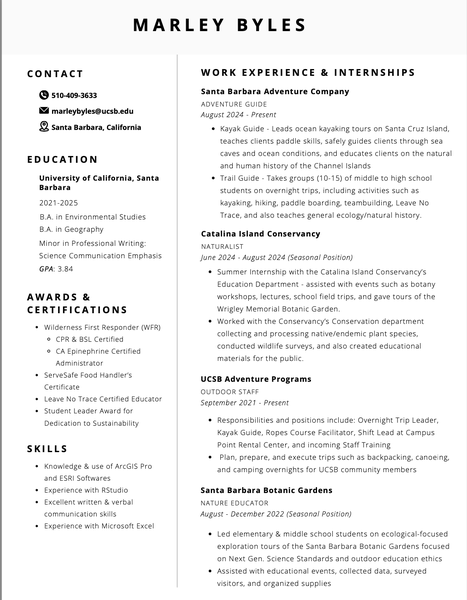 Hello everyone, my name is Marley Byles, and I am a recent graduate of UC Santa Barbara! I graduated with a double major in Environmental Studies and Geography, and a minor in Professional Writing for Science Communication. I have a strong passion for all things coastal, and I'm also interested in the California Channel Islands. I love all things outdoors, and hope to work in Conservation & Restoration after graduation!